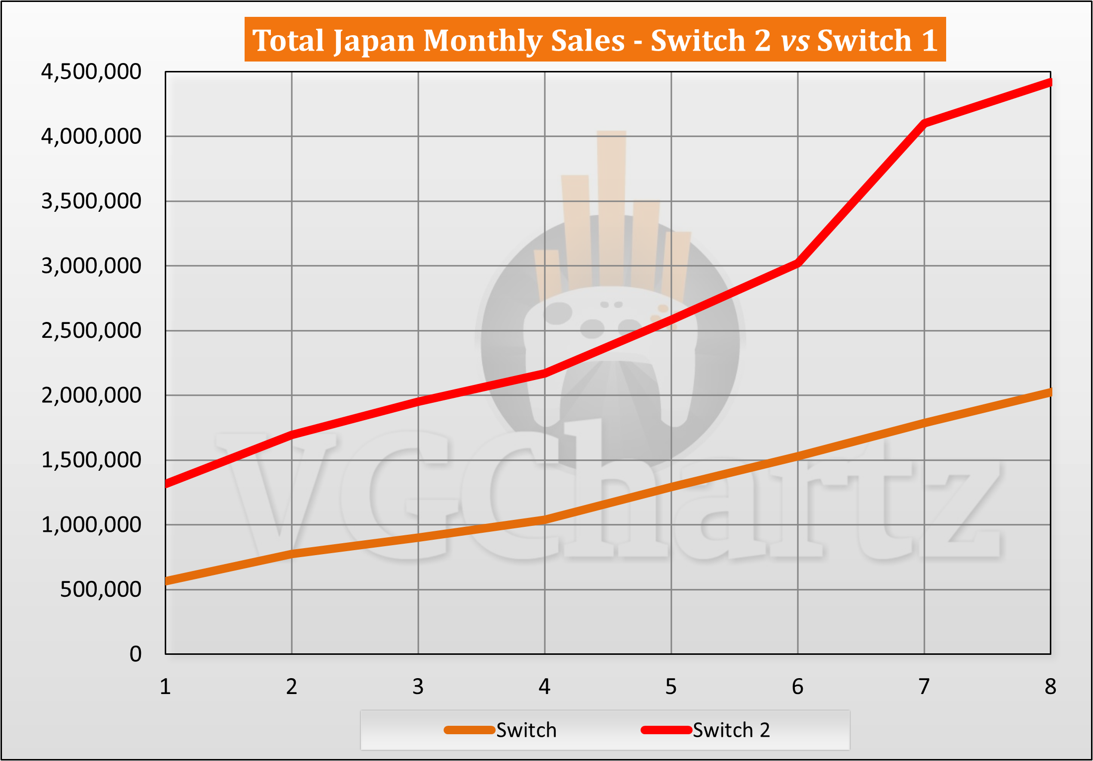 Switch 2 の 8 か月目は 2026 年 1 月で、Switch 1 の場合は 2017 年 10 月です。同じ期間に Switch 2 は 442 万台、Switch 1 は 202 万台を販売しました。